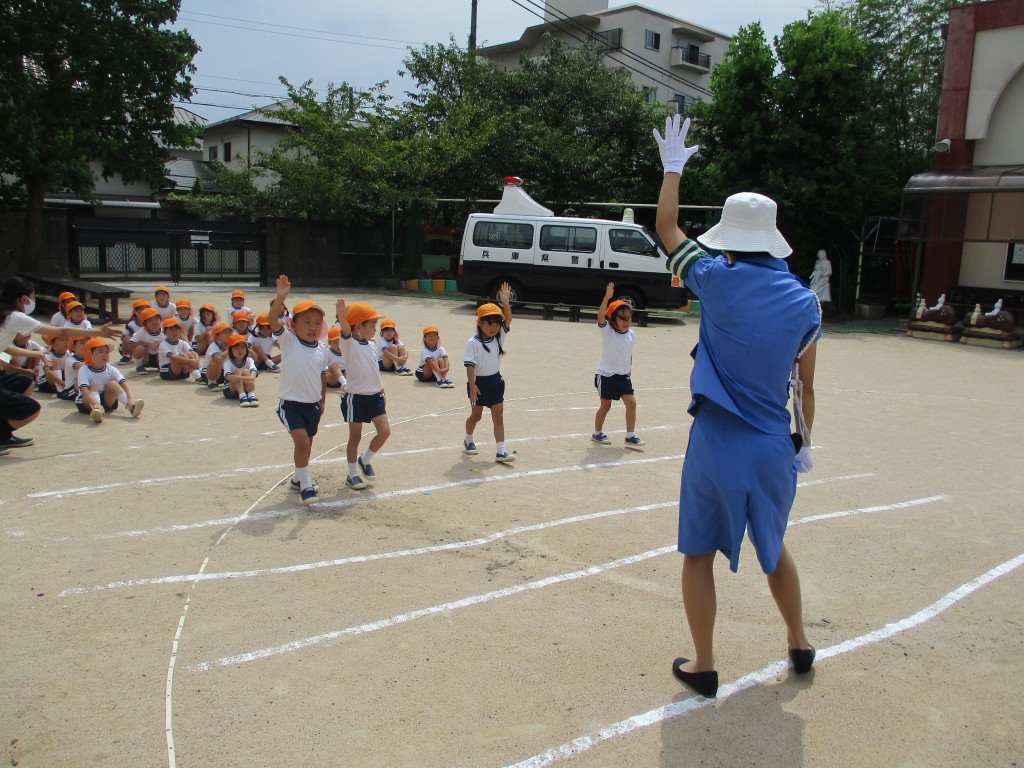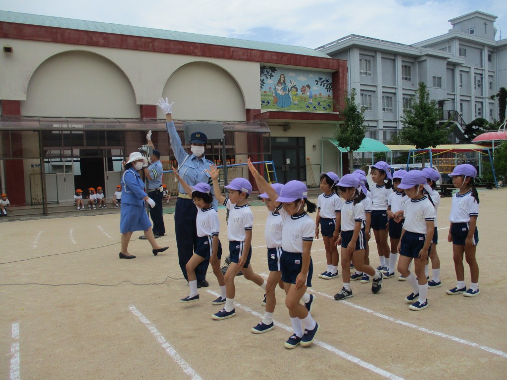 年長組 交通訓練 2020.09.03 イベント 今日はたるみけいさつからパトカーに乗っておまわりさんが来てくださいました。「みんなのいのちはだれがまもりますか?」「きいろになったらどうしますか?」と信号のお話や横断歩道の渡り方を丁寧に教えてくださいました! 1年生になったら一人で渡るようになりますね 今日教えて頂いたこと、忘れないで歩きましょうね☆