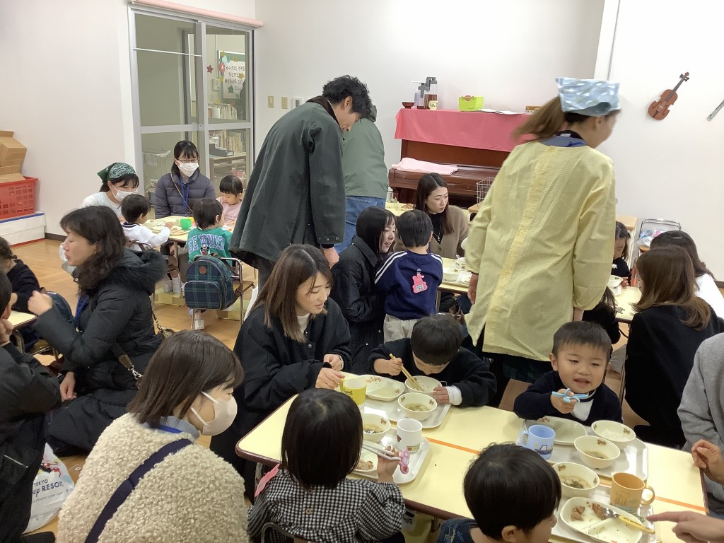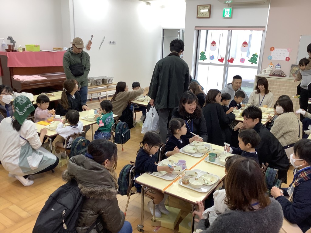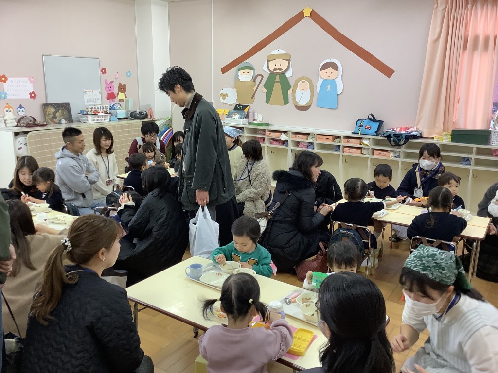 満3歳児・プリキンダークラス給食参観 2024.12.13 イベント そら組、ほし組、もも組の給食参観がありました! おうちの方が見守っている中、楽しそうに食べるお友達もいれば、ちょっぴり緊張しているお友達もいました!しっかり自分で食べる姿も見ていただきました。おかわりをするお友達もいて、美味しく食べられて嬉しかったですね!