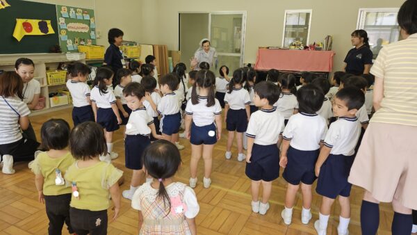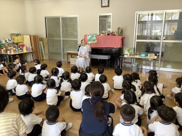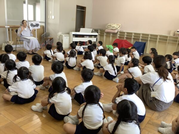 『ありんこちゃんと ハト』の紙芝居をみんなで聞きました。困っているありんこちゃんを助けたハト。ハトの命を守ったありんこちゃん。お互いに思いやる心の大切さ、そして「ありがとう」と言うことの大切さを教えていただきました。