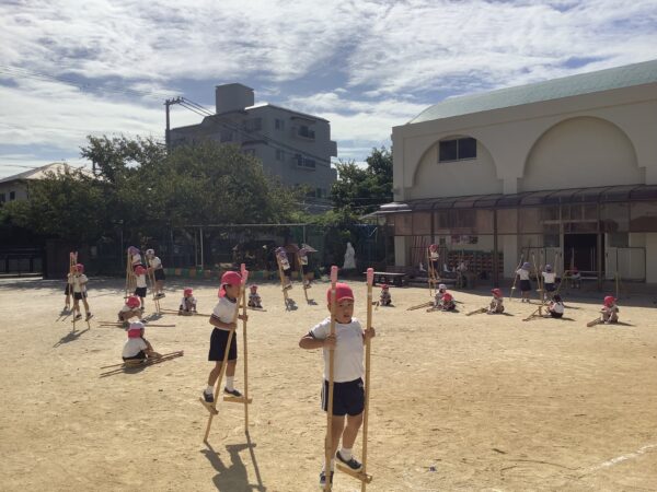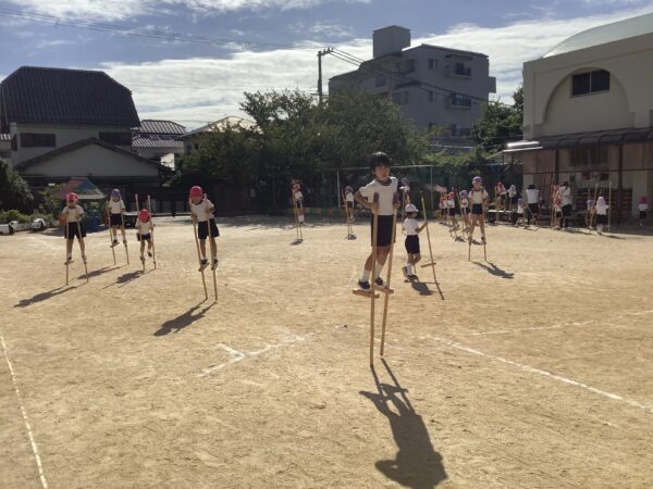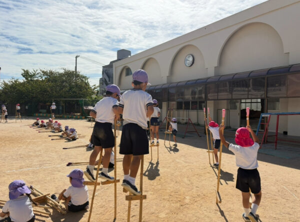 年長 竹馬チャレンジ 2025.10.10 イベント 秋晴れの空の下、最後の竹馬チャレンジを行いました。 運動会を終えたあとも、継続して竹馬を楽しむ姿や「もっと高くしたい!」と意気込む様子が見られています! これまでを振り返ったり、互いに見合いっこをしたり、、 よく頑張ったね!と互いにこれまでを褒め合いっこをし素敵な1日となりました✨