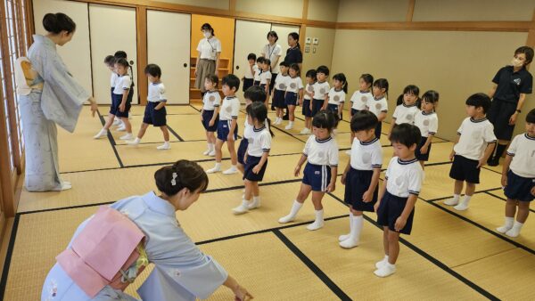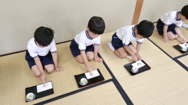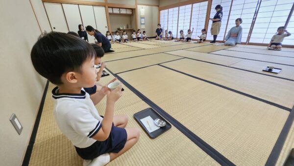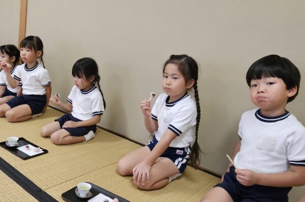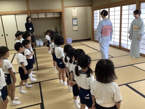 年中組 茶道教室 2025.10.10 イベント 今日は今年度初めての茶道教室でした。 和室でのお作法や季節のお話について教えていただきました。 お煎茶や練り切りも美味しくいただけましたね。今日のお菓子は、「重陽の節句」にちなんだ菊の花でした。 “着せ綿”についても教わることができ、日本の伝統文化に親しむ1日となりました。
