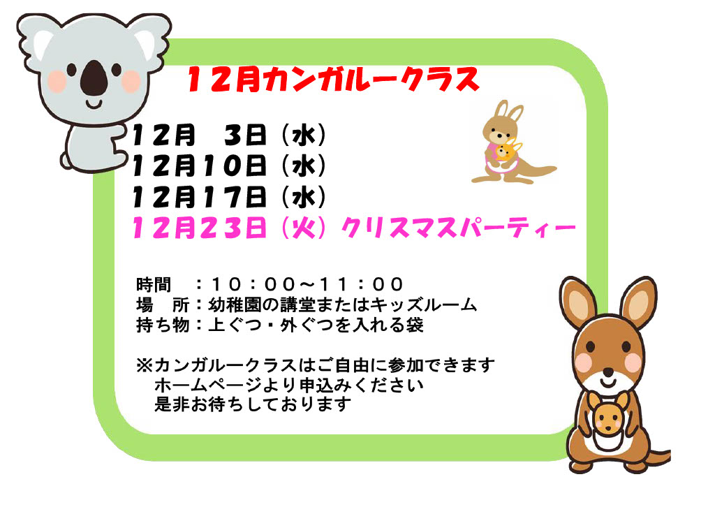12月カンガルークラスのご案内 2025.11.25 イベント お知らせ 未就園児 重要 愛徳幼稚園では、週1回(水曜日)にご参加いただける未就園児教室『カンガルークラス』を開催しております。入園前のお子さまなら、どなたでも参加できます。親子共々、たくさんの出会いの場となることを願い、こころよりお待ちしております。 12月のカンガルークラス開催予定日 12月 3日(水) 12月10日(水) 12月17日(水) 12月23日(火)クリスマスパーティー 楽しいプログラムをご用意してお待ちしております。 是非、ご参加ください。 詳細、お申し込みはこちら