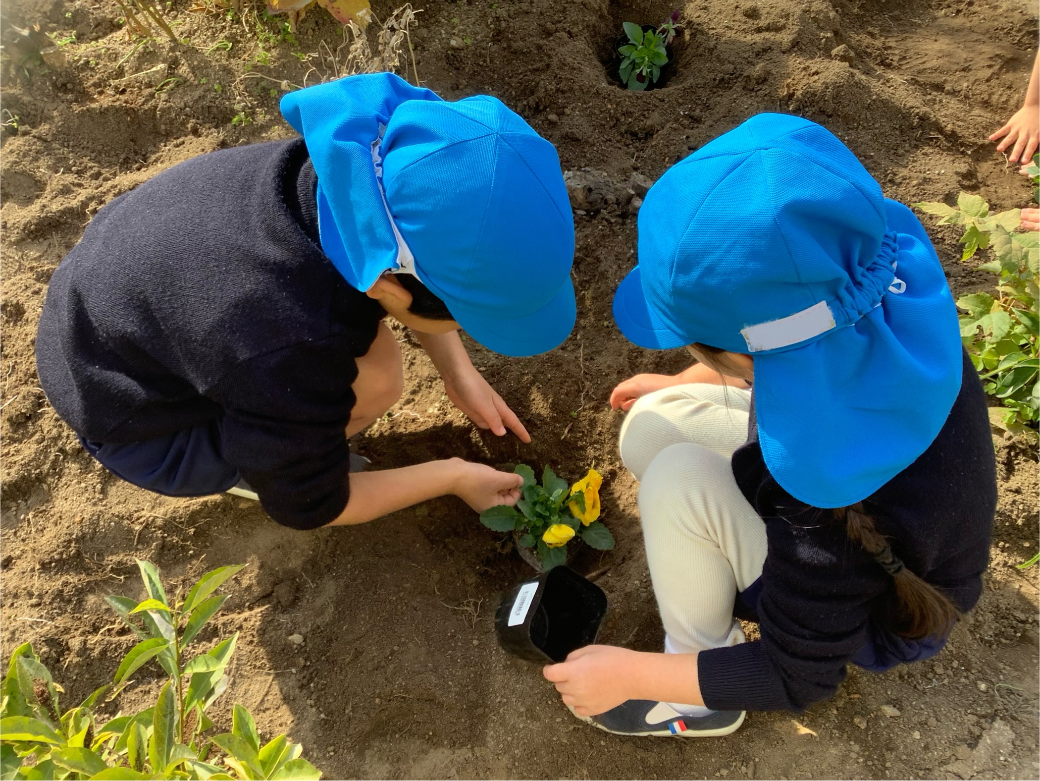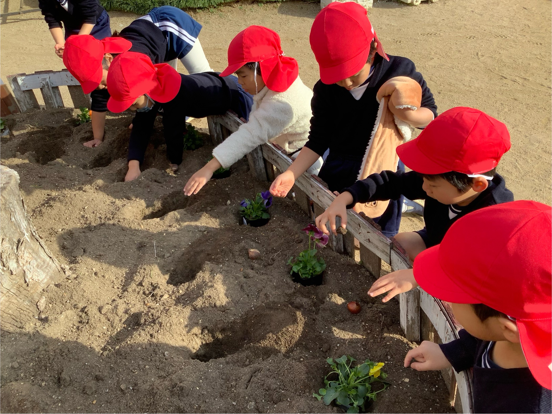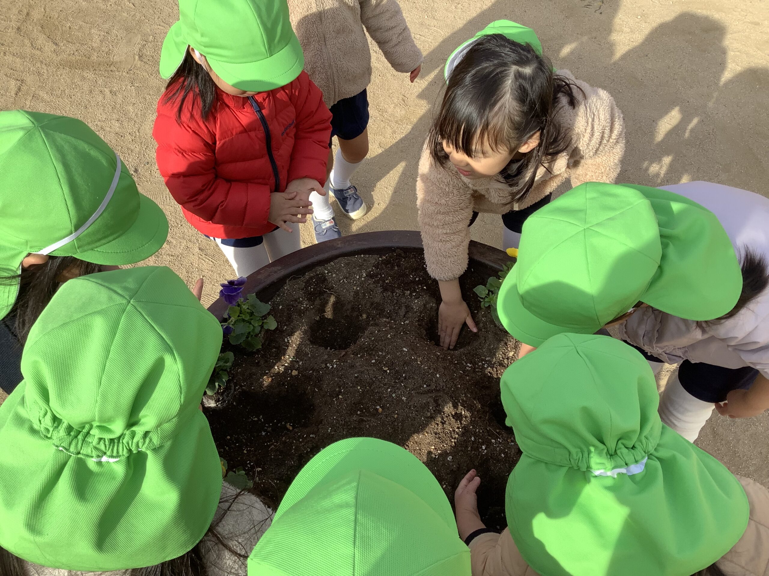 今日は年中組みんなでパンジーやビオラ、チューリップの球根を植えました。