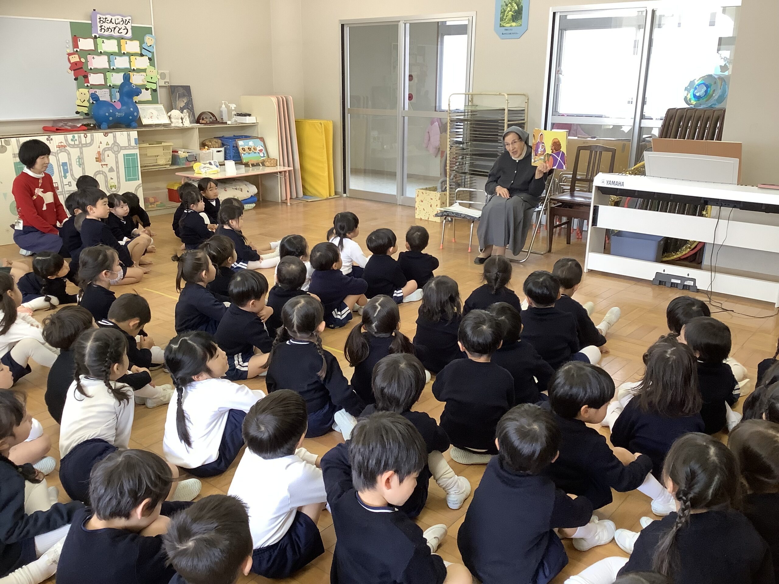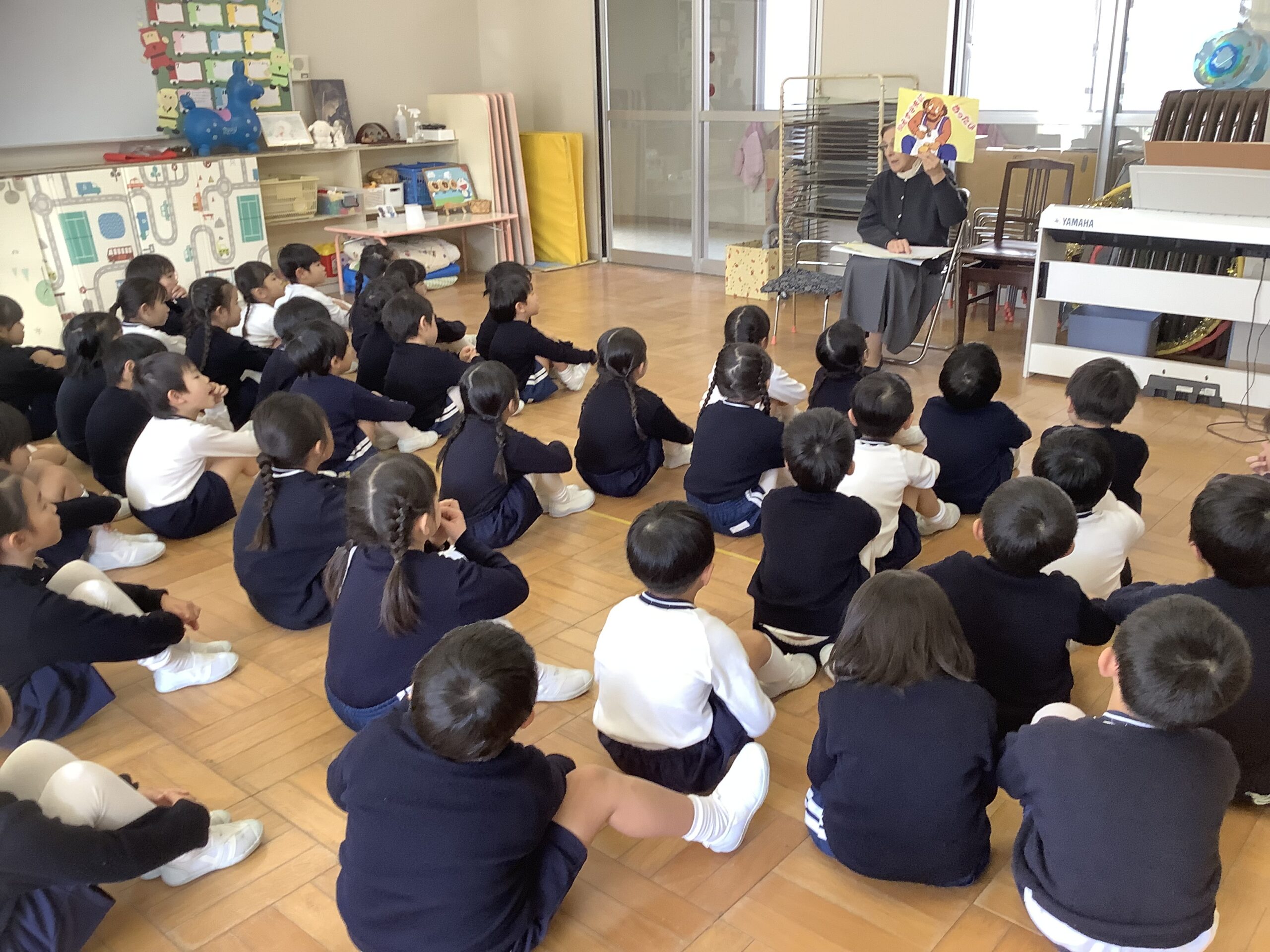 シスターのお話 2025.12.17 お知らせ 2学期最後のシスターのお話がありました。「イエスさまにあったひ」というお話をして下さりました。 みんなの心の中にはイエスさまがいらっしゃって、どんな時もまわりの人にやさしくすることができることを学びました。 おうちの人や先生、お友達にやさしいお心でお手伝いをしたり、一緒に遊んだりできるといいですね。