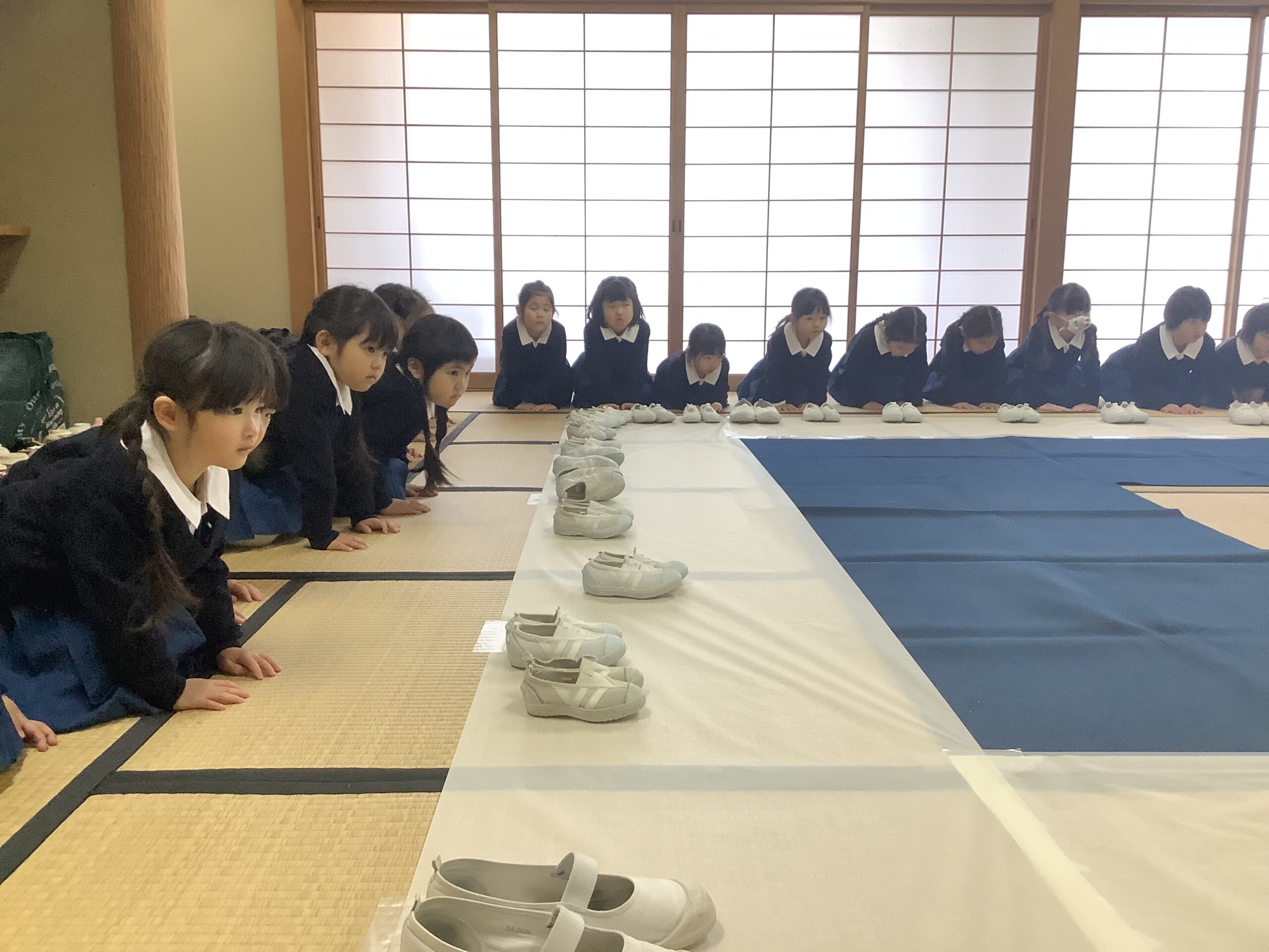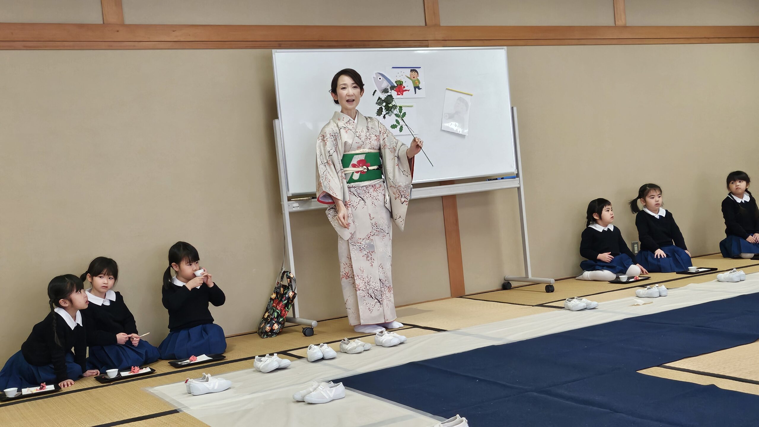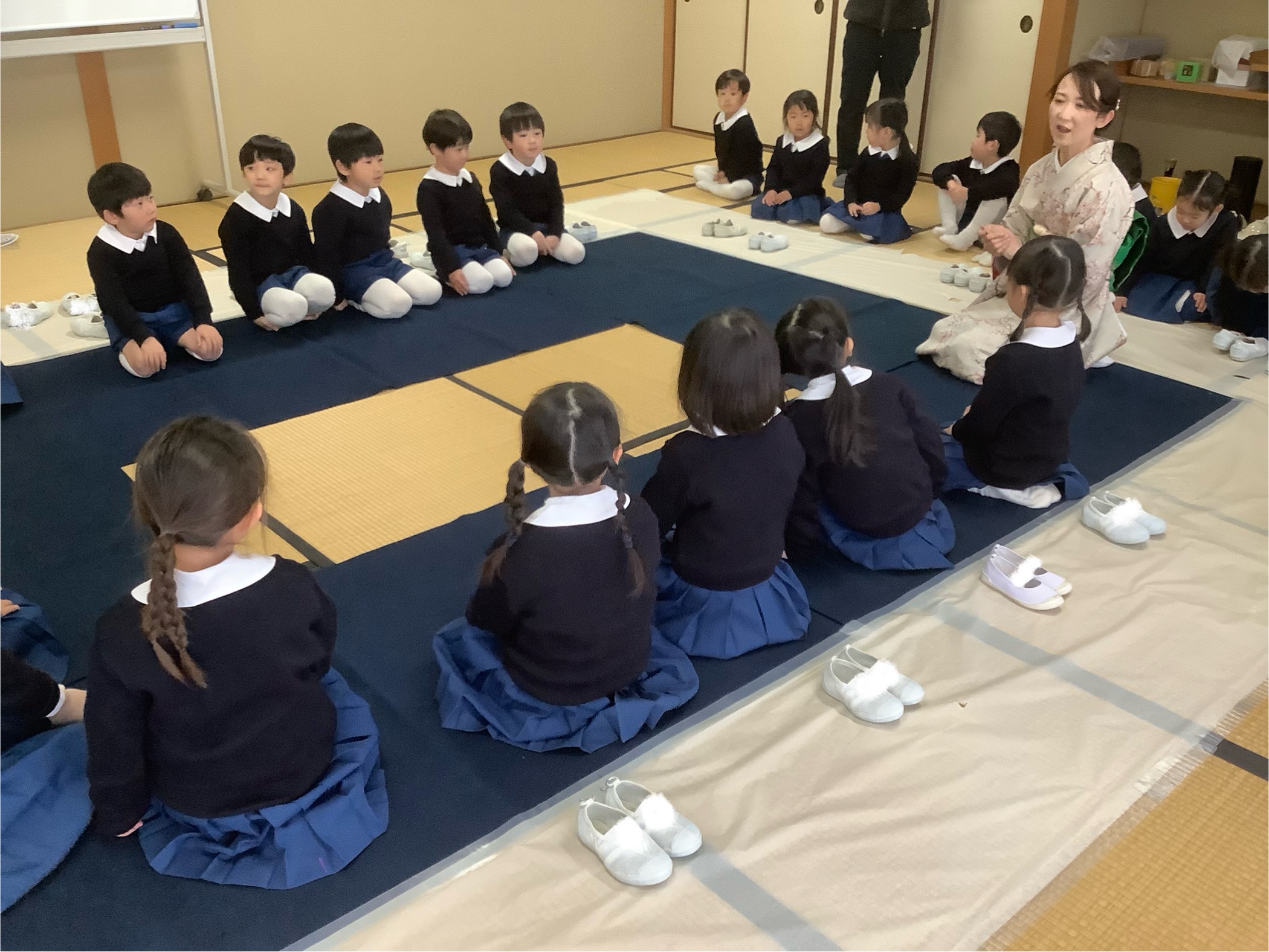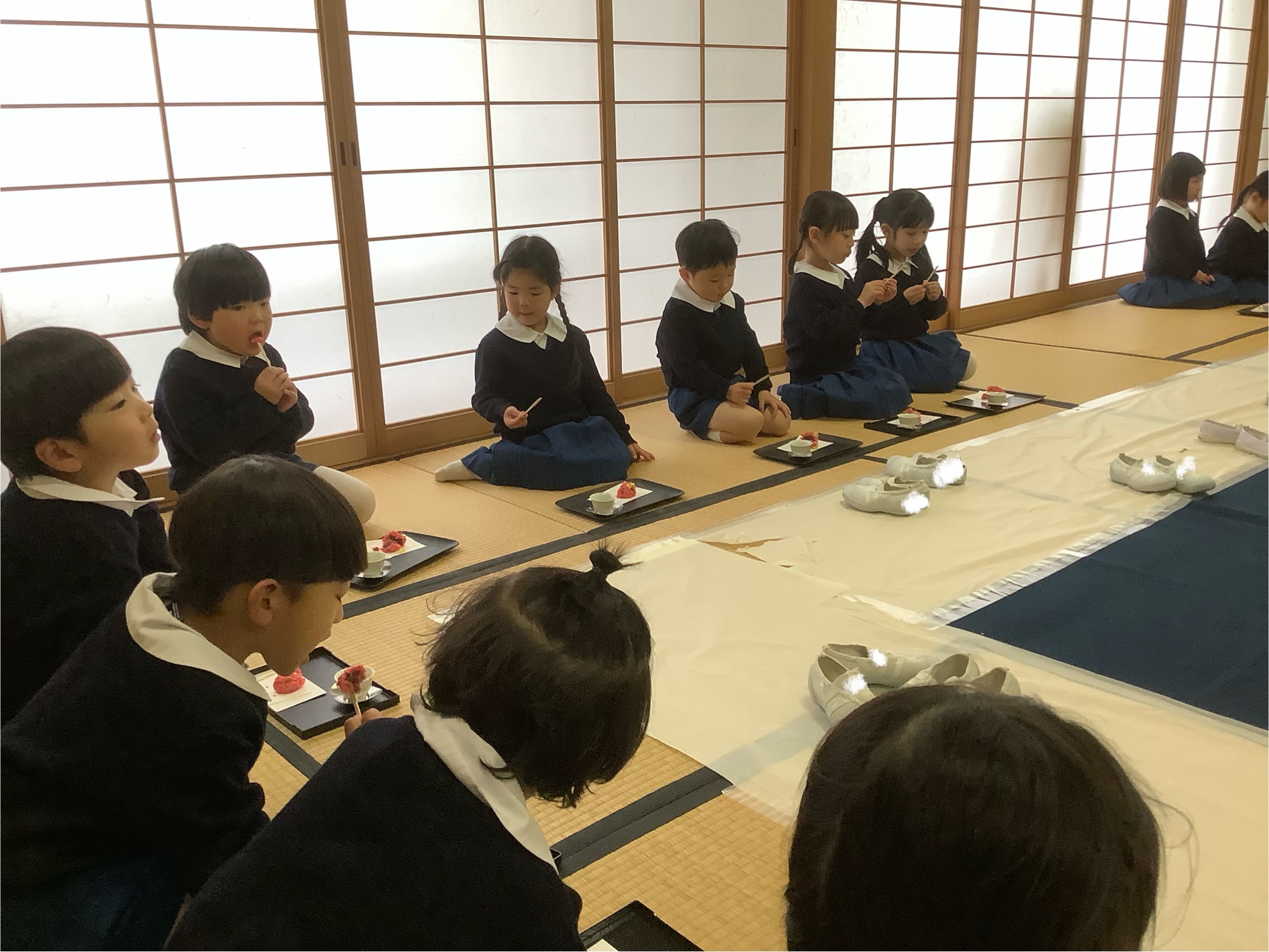 年中組 茶道教室 2026.01.26 イベント 今日は年中組2回目の茶道教室があり、制服を着て参加しました。 今回は玄関の御作法を教えていただきました。靴の脱ぎ方、玄関への上がり方などたくさん知る事が出来ましたね。 そしてみんなが楽しみにしていた、お煎茶と和菓子の時間。 和菓子は節分にちなんで鬼の和菓子を頂きました。 節分の事についてもたくさん知る機会となりました。