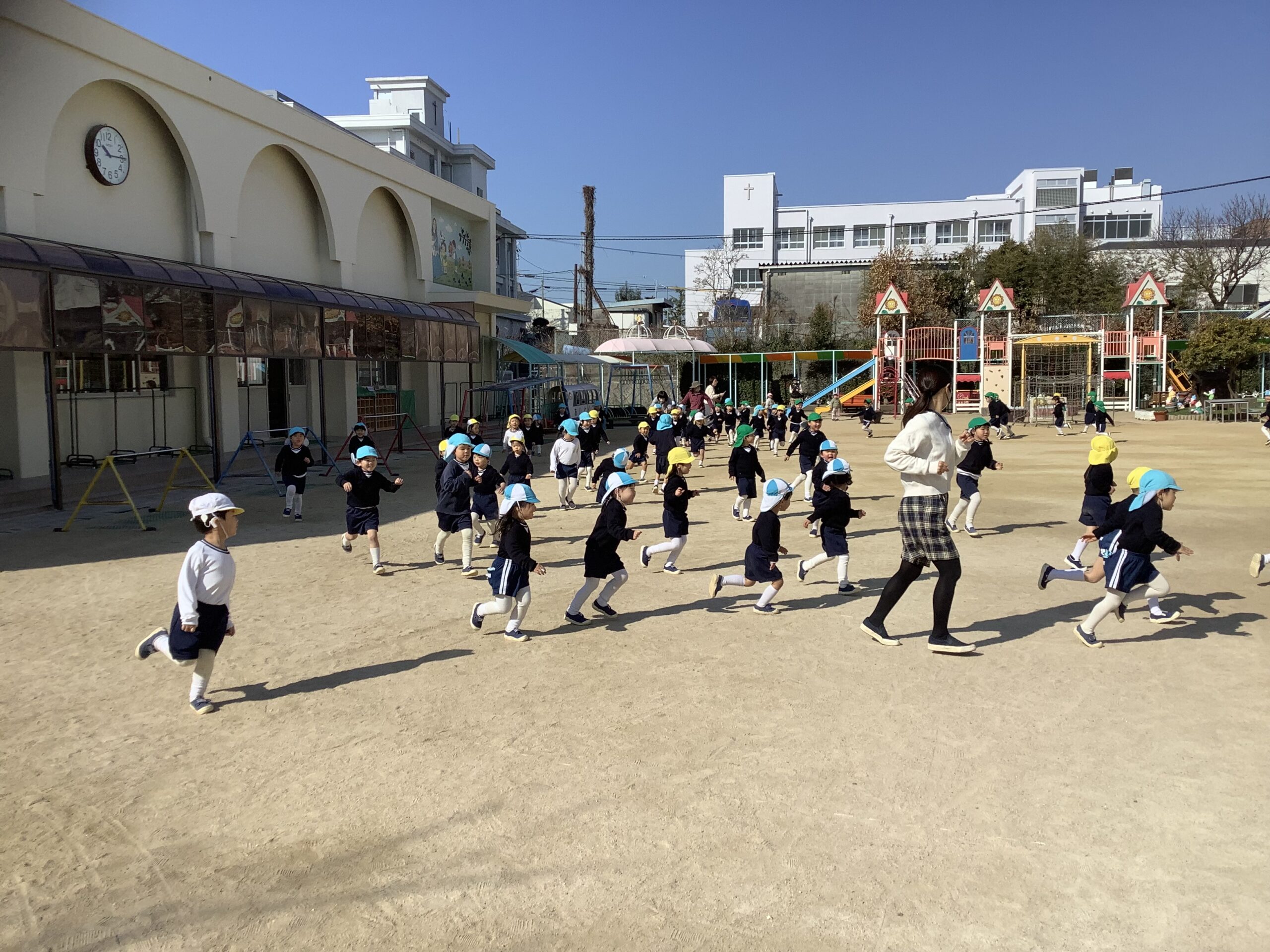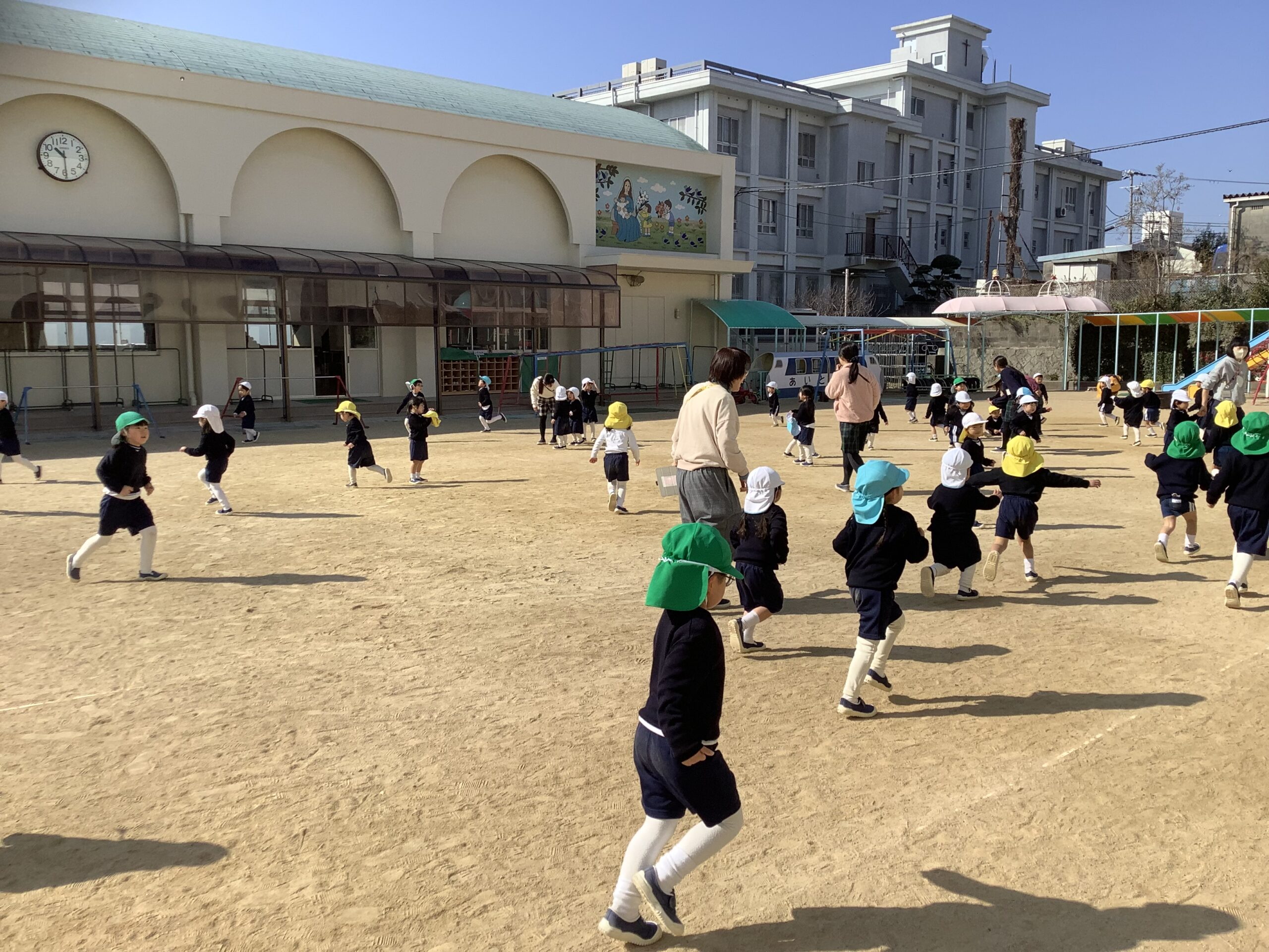 満3歳・年少組 わくわくday 2026.02.18 イベント 今日は暖かな日差しの中、わくわくdayをしました。 マラソンで体を温めたあと、動物おにごっこをしました。 クラスごとに動物に変身して、なりきりながらおにごっこを楽しみました。 広い園庭、気持ちがいいです! 開放感を味わいながらライオン、ちょうちょ、ペンギン、うさぎ…色んな動物になりましたね! また違う動物にも変身して遊びたいですね!