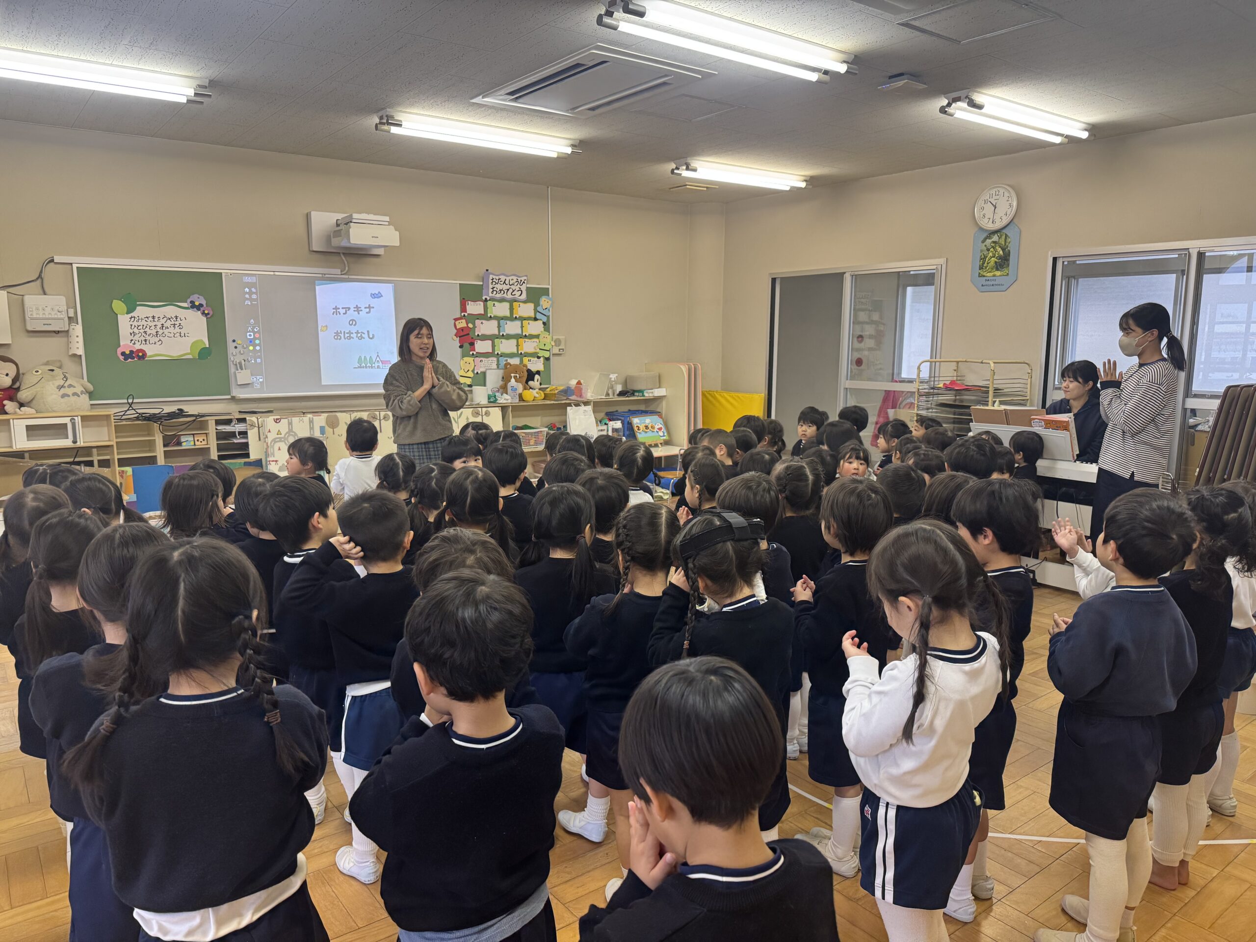 満3歳・年少組 神様のお話 2026.02.25 イベント 今回の神様のお話は、幼稚園をつくってくださったホアキナさまについての絵本を見ました。 ホアキナさまはとてもやさしいお心を持った方ですね。ホアキナさまのように、お友だちやおうちの人にやさしくできると素敵ですね。 2月26日は愛徳幼稚園のお誕生日です。 大好きな愛徳幼稚園がこれからもずっと続いていきますように、あたたかいお心でお祝いしましょうね。